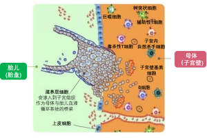 而母体与胎儿界面(maternal‐fetal interface)是进行免疫调节的主要领域,也就是子宫内膜壁和胎盘界面。免疫细胞透过细胞浸润方式到达子宫壁并执行其免疫功能,其中,白血球至少占子宫壁基质细胞总数的40%,之中存在的白血球也包括蜕膜自然杀手细胞(uNK)、巨噬细胞、淋巴细胞(CD4, CD8 T)、调节性T细胞(Treg),和树突状细胞(DC)等。