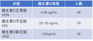 1) 将桉例区分为维生素D正常、不足和缺乏组别
