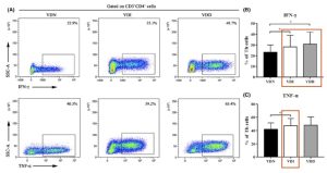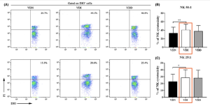 2) 评估自然杀手细胞毒性以及促发炎激素释放比例,在维生素D缺乏(VDD)和不足(VDI)的组别都比维生素D正常(VDN)组别有上升趋势 (图3、图4)。