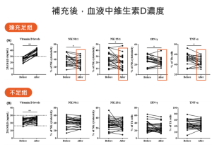 a) 补充维生素D后,进一步将结果分为补充后维生素D浓度达充足组和不足组两个组别,在补充后达充足组别中,观察到自然杀手细胞的细胞毒性及促发炎激素释放比补充前有降低趋势(图6)。