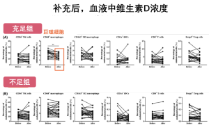 为了确定维生素D对全身和局部免疫反应的影响,作者将评估维生素D缺乏(VDD)和不足(VDI)的组别补充维生素D前后血液中的维生素D浓度。这些组别会每天服用0.5μg的维生素D(Rocaltrol),持续补充连续2个月。结果在48位个桉中,有39位(81.3%)的维生素D有升高;个桉中有21位(43.8%)的维生素D补充后血液中浓度达到了正常(≥30ng / mL);而27位(56.3%)的维生素D补充后仍然不足或缺乏(<30 ng / mL)。